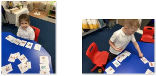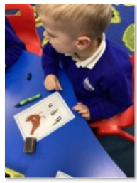 In literacy, the children have been working on Colourful Semantics. They selected a “who” and a “what” card to build simple sentences, then wrote the initial sounds they could hear. Many children also attempted to write the full sentence independently, showing growing confidence in their early writing skills.
