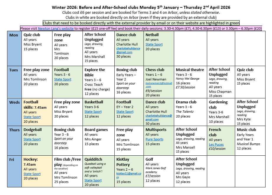 After-school club timetable January - Easter 2026