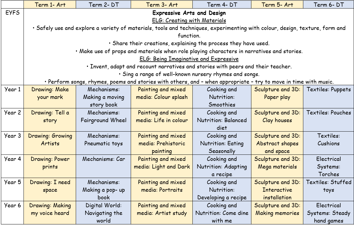 The impact of this curriculum design will lead to excellent progress over time, across key stages, relative to a child’s individual starting point and their progression of skills as well as fostering a love of and enthusiasm for the subject. They will learn that art and DT has changed our lives and understand that it is vital to the world’s future prosperity. This is evidenced in a range of ways, including pupil voice, their work and their enjoyment for art and DT.