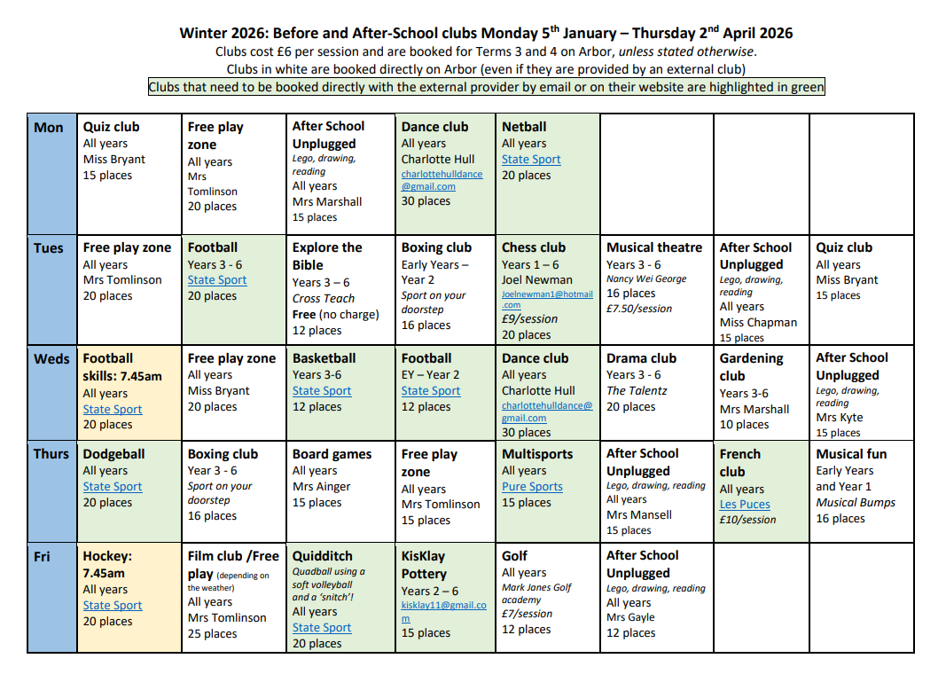 Clubs cost £6 per session and are booked for Terms 3 and 4 on Arbor, unless stated otherwise.